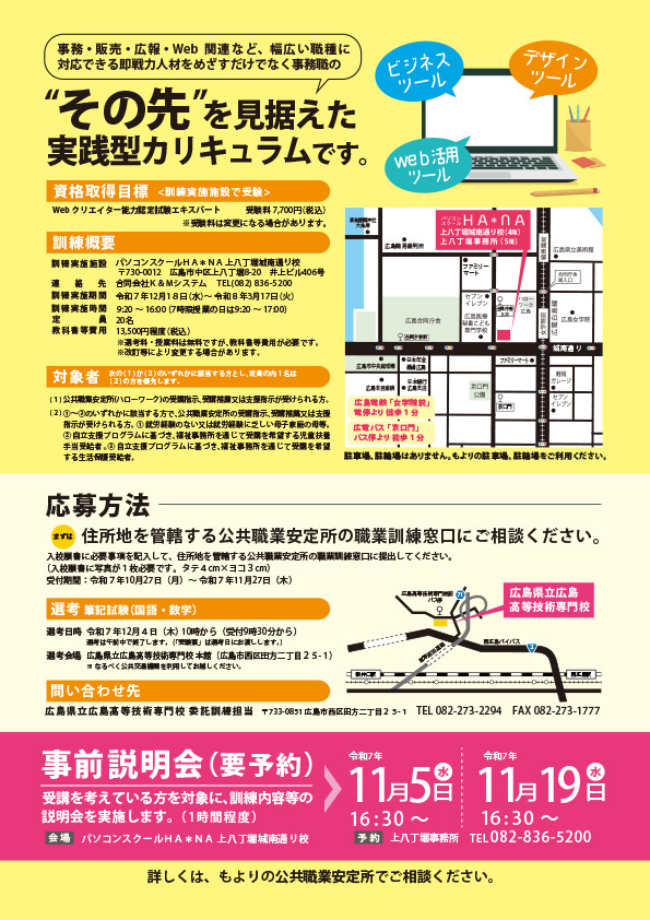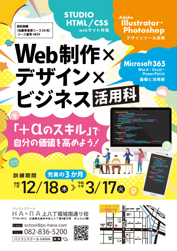 現在パソコンスクールHA*NAでは、下記コースの募集を行っております。Web制作×デザイン×ビジネス活用科 上八丁掘城南通り校〜(3か月)